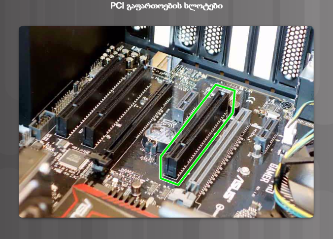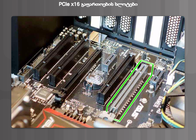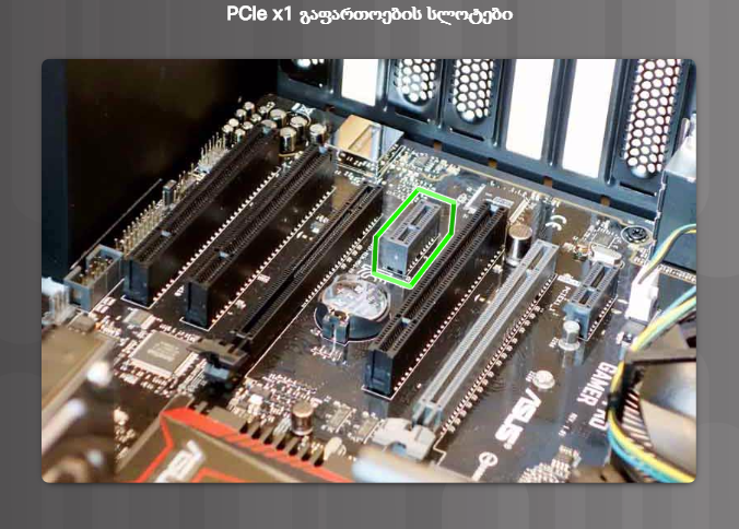 • PCIe სლოტი PCI Express გააჩნია ოთხი ტიპი სლოტებისა: x1 (სურათი 2), x4, x8, და x16 (სურათი 3). მიაქციეთ ყურადღება, რომ ამ სლოტების სიგრძე იზრდება მათი ნომრების ზრდასთან ერთად, X1-დან x16 -მდე.