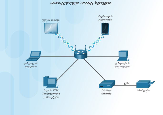 ეფფლის AirPort Extreme, როგორც ნაჩვენებია სურათ 2-ზე, წარმოადგენს მაგალითს აპარატურული ბეჭდვის სერვერისა. AirPort Extreme-ს შეუძლია AirPrint service-ის საშუალებით გაუზიაროს პრინტერი ქსელში ნებისმიერ მოწყობილობას.