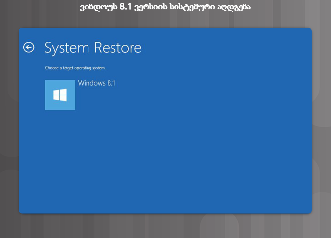 აღნიშნული უტილიტა კომპიუტერს ძველ მდგომარეობაში (წინა აღდგენის წერტილი) დააბრუნებს. System Restore ხელმისაწვდომია როგორც ვინდოუსის გარემოდან, ასევე კომპიუტერის ჩატვირთვის პროცესში, მისი მეშვეობით შესაძლებელია დაზიანებული სისტემის აღდგენა და ხელახლა ჩატვირთვა. პირველ სურათზე ნაჩვენებია System Restore ვინდოუს 8.x-ისთვის. მე-2 სურათზე ნაჩვენებია System Restore ვინდოუს 7-ისა და ვისტასთვის.