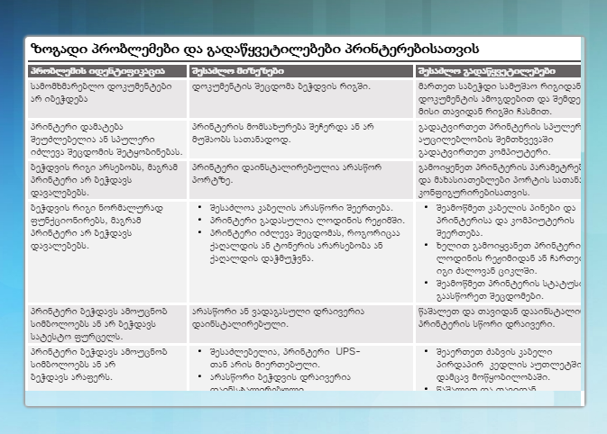 პრინტერის პრობლემა შეიძლება იყოს ტექნიკური, პროგრამული, ქსელური ან ამ სამიდან რომელიმეს კომბინაცია. თქვენ გადაწყვეტთ პრინტერის რომელიმე ტიპის პრობლემას უფრო ხშირად, ვიდრე სხვას. სურათზე მოცემულია ყველაზე გავრცელებული პრობლემები და მათი შესაძლო გადაწყვეტის გზები.