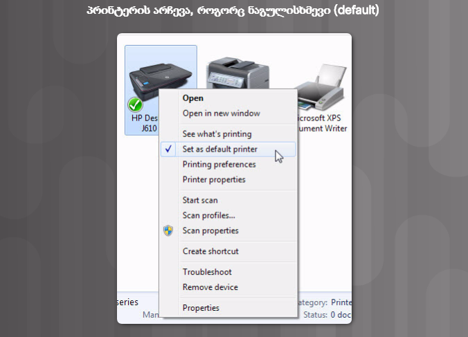 ნაგულისხმევი პრინტერის დასანიშნად მაუსის მარჯვენა კლავიშა დააჭირეთ პრინტერების ნიშნულს და ამოირჩიეთ დააყენე როგორც ნაგულისხმევი (Set as default printer) .