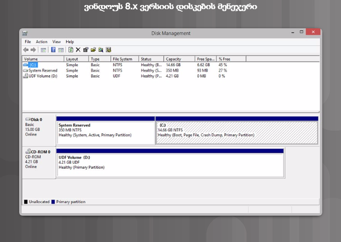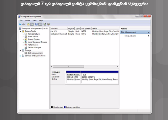 Start-ის მენიუ > ვაჭერთ მარჯვენა ღილაკით (კონტექსტური მენიუ) Computer (კომპიუტერი) > Manage (მართვა) > და ვირჩევთ Disk Management (დისკების მართვა)