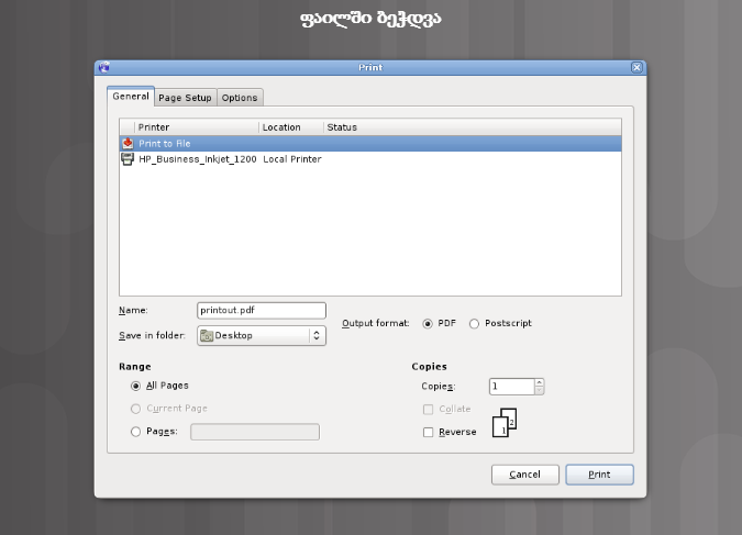ბეჭდვითი დავალების ფაილში გადაგზავნის ტიპიური მეთოდია შემდეგი: