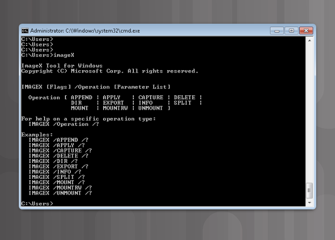 ნაბიჯი 2. გამოვიყენოთ პროგრამული უზრუნველყოფა, როგორიც არის ImageX, ინსტალაციის იმიჯის(ასლის) შესაქმნელად. სურათზე ნაჩვენებია ImageX -ისბრძანებათა სტრიქონი.