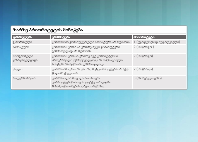 თითოეულ მომსახურების ცენტრს გააჩნია პოლიტიკა ზარების პრიორიტეტებად დაყოფასთან დაკავშირებით. სურათი 3 გვაწვდის მარტივ ცხრილს, თუ როგორ შეიძლება ზარებს დავარქვათ სახელი, განვსაზღვროთ და მივანიჭოთ პრიორიტეტი .