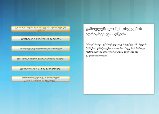 მომსახურების ცენტრის ყველა კომპიუტერში ჩაწერილია სპეციალისტებისთვის განკუთვნილი დამხმარე პროგრამული უზრუნველყოფა. ტექნიკოსები იყენებენ ამ პროგრამას სამსახურეობრივი ფუნქციების სამართავად და შესასრულებლად. სურათი 2 გვიჩვენებს დამხმარე პროგრამული უზრუნველყოფის მახასიათებლებს.