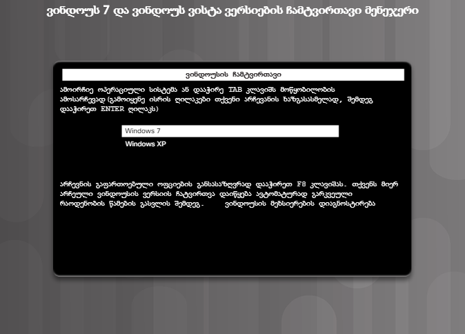 ერთ კომპიუტერზე შესაძლებელია მრავალი ოპერაციული სისტემის დაყენება. ზოგიერთ პროგრამულ უზრუნველყოფას ოპერაციული სისტემის უახლესი ვერსია სჭირდება, ხოლო სხვებს შესაძლოა ძველი ვერსიის მხარდაჭერა ჰქონდეთ. როდესაც კომპიუტერზე რამდენიმე ოპერაციული სისტემა აყენია, არსებობს ორმაგი ჩატვირთვის პროცედურა. თუ ჩატვირთვის პროცესში ვინდოუსის ჩატვირთვის მენეჯერმა (BOOTMGR-მა) აღმოაჩინა ერთზე მეტი ოპერაციული სისტემა, შემოგთავაზებთ შესაბამისი ოპერაციული სისტემის არჩევას. პირველ სურათზე ნაჩვენებია BOOTMGR ვინდოუს 8.x-ისთვის, ხოლო მე-2 სურათზე – ვინდოუს 7-ისა და ვისტასთვის.