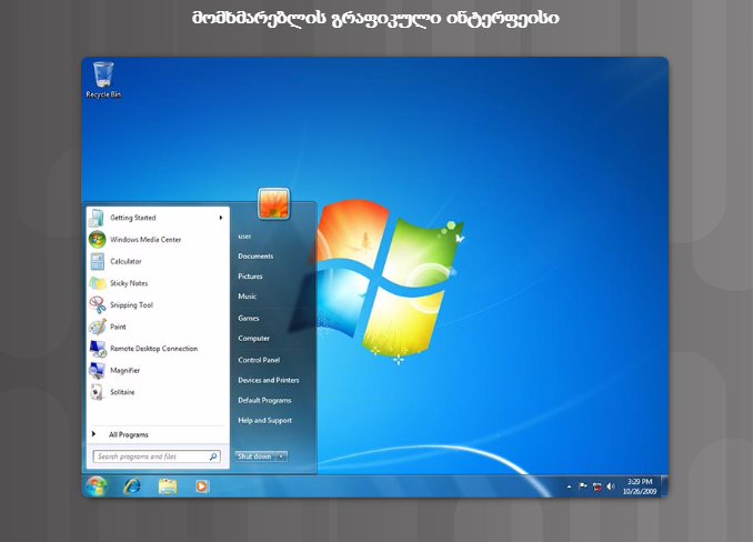- გრაფიკული სამომხმარებლო ინტერფეისი(GUI)-მომხმარებელი იყენებს მენიუებსა და პიქტოგრამებს, როგორც ეს ნაჩვენებია მე-2 სურათზე.