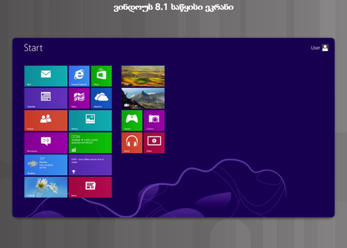 პროცესის დასრულების შემდეგ გამოჩნდება Start Screen (საწყისი ეკრანი), როგორც ეს მე-10 სურათზეა ნაჩვენები.  როდესაც ვინდოუს 8.1-ის Start Screen (საწყისი ეკრანი) გამოჩნდება, ინსტალაცია დასრულებულია და კომპიუტერი მზად არის გამოყენებისთვის.