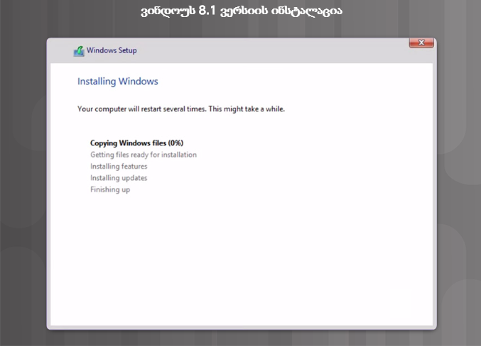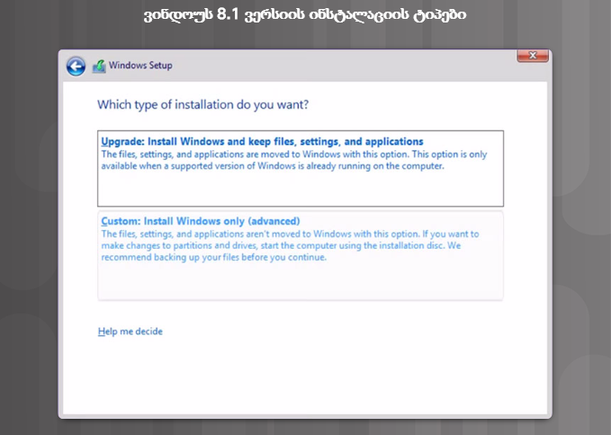 ვინდოუს ოპერაციული სისტემის 8.x, 7 და ვისტა ვერსიების ინსტალაციის პროცესი ერთმანეთს გავს. აღნიშნული პროცესი ქვემოთ დეტალურად არის აღწერილი ვინდოუს 8.1-ის მაგალითზე
