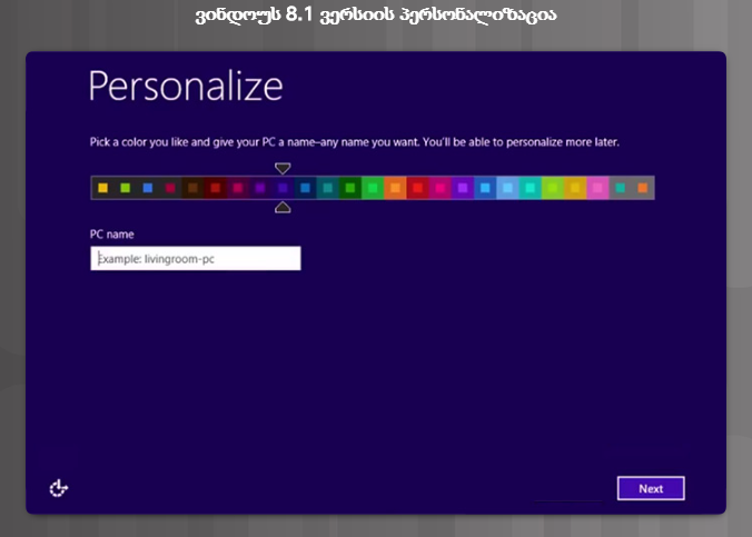 Personalization  ფანჯარაში (სურ. 4) ინსტალაციის პროგრამა გვთხოვს კომპიუტერის სახელის მითითებას და გვაძლევს თემის(გაფორმების სტილი) საბაზისო ფერის არჩევის საშუალებას.