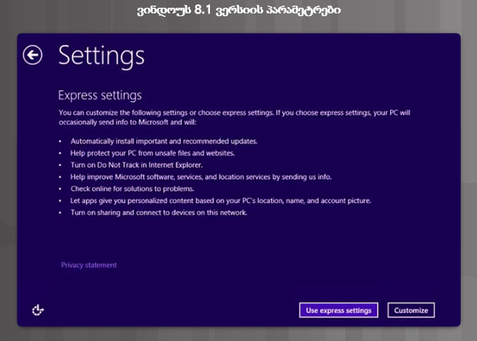 მე-6 სურათზე ნაჩვენებია ინსტალატორის სტანდარტული პარამეტრები.  აღნიშნული პარამეტრების დაყენება რეკომენდირებულია ინსტალატორის მიერ კომპიუტერის სკანირების შემდეგ.  დააჭირეთUse express settings (სტანდარტული პარამეტრების გამოყენება) ნაგულისხმევი პარამეტრების მიღებისა და გამოყენების მიზნით.  ასევე შეგიძლიათ შეცვალოთ ნაგულისხმევი პარამეტრები, თუ აირჩევთ Customize (მორგება).