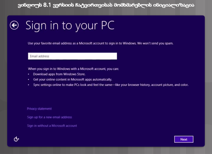 ინსტალატორი მოგთხოვთ ელექტრონული ფოსტის მისამართს მაიკროსოფტის ანგარიშის შესაქმნელად.  ფოსტის მითითება სავალდებულო არ არის, თუმცა ის უზრუნველყოფს ვინდოუსის ონლაინ-მაღაზიასთან (Windows Online Store) წვდომას.  შეიყვანეთ ელექტრონული ფოსტის მისამართი და დააჭირეთ NEXT (შემდეგ), როგორც მე-7 სურათზეა ნაჩვენები.  თუ გსურთ ანგარიშთან მიბმის გამოტოვება და მომხმარებლის ლოკალური ანგარიშის შექმნა, დააჭირეთ Sign In without a Microsoft account (სისტემაში შესვლა მაიკროსოფტის ანგარიშის გარეშე).
