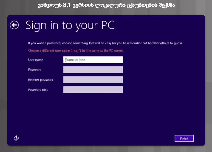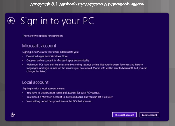 თუ მაიკროსოფტის ანგარიში არ შექმნილა, ინსტალატორი გამოიტანს ასეთ ეკრანს (სურ. 8).  მომხმარებელს შეუძლია შექმნას მაიკროსოფტის ანგარიში ან ისარგებლოს ლოკალური ანგარიშით.  მე-9 სურათზე ნაჩვენებია, რა ინფორმაციას ითხოვს ინსტალატორი მომხმარებლის ადგილობრივი (ლოკალური) ანგარიშის შესაქმნელად.