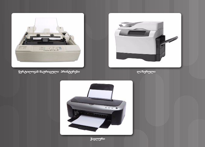 დღეს არსებული პრინტერებიდან ძირითადად უნდა გამოვყოთ ლაზერული პრინტერები, რომლებიც იყენებენ სპეციალურ გრაფიკულ დოლურებს და ჭავლური პრინტერები, რომელნიც მოქმედებენ ელექტროსტატიკური შხეფის, ე.წ. spray ტექნოლოგიით. მატრიცული პრინტერები გამოიყენებენ ზემოქმედების ტექნიკას და სპეციალურ ლენტურ ტექნოლოგიას. სურათი 1 აჩვენებს სამი სახის პრინტერს.