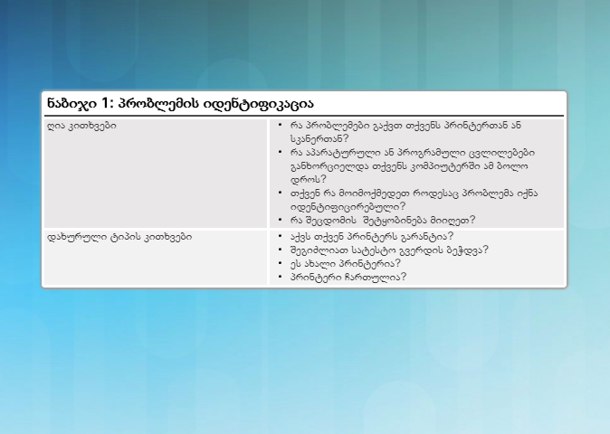 გაუმართაობების აღმოფხვრის პროცესში პირველი ნაბიჯი მოიცავს პრობლემის იდენტიფიკაციას. ნახაზზე ნაჩვენებია მომხმარებლისათვის დასასმელი ღია და ფარული კითხვები.