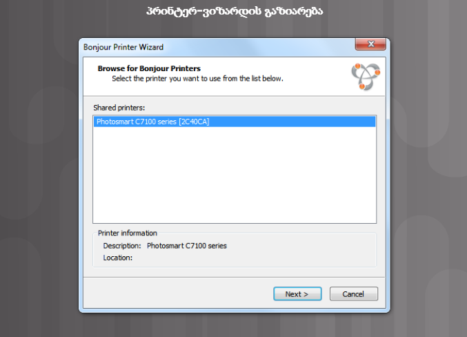 ერთხელ ჩამოწერილი და დაინსტალირებული Bonjour სერვერი მოქმედებს ფონურ რეჟიმში და თვითონ აღმოაჩენს ქსელთან მიერთებულ თავსებად პრინტერებს. გახსენით Bonjour პრინტერის გზამკვლევი ვინდოუსის კომპიუტერის დასაკონფიგურირებლად, როგორც ნაჩვენებია ნახაზზე.