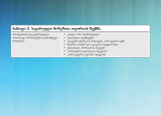 მომხმარებელთან გასაუბრების შემდეგ, თქვენ უკვე შეგიძლიათ ჩამოაყალიბოთ თეორიულად შესაძლო მიზეზები. ნახაზზე ნაჩვენებია სია პრინტერებთან დაკავშირებული ზოგიერთი გავრცელებული პრობლემების სავარაუდო მიზეზებისა. აუცილებლობის შემთხვევაში ჩაატარეთ შიდა ან გარე კვლევა, რომელიც დაეფუძნება მოცემულ შეცდომის სიმპტომებს.