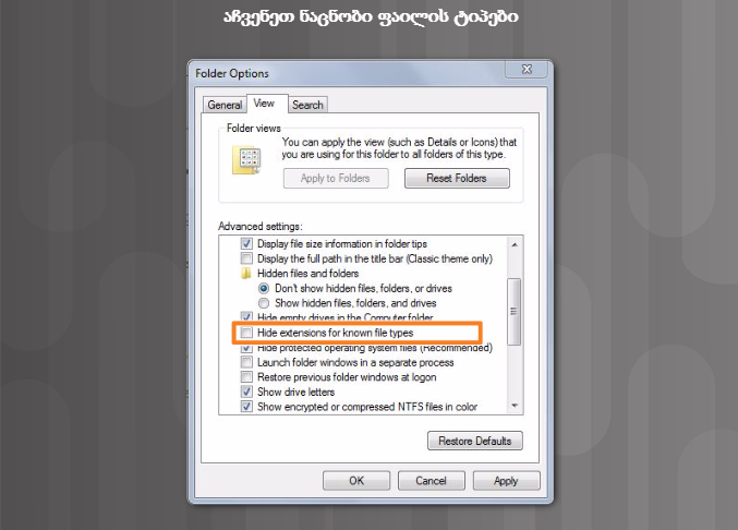 ნაგულისხმევად, ფაილების გაფართოებები არ ჩანს.  გაფართოების სანახავად აუცილებელია გაითიშოს პარამეტრი Hide extensions for known file types (რეგისტრირებული ფაილის სახეობების გაფართოებების დამალვა)როგორც სურათზეა ნაჩვენები, აღნიშნული პარამეტრი ხელმისაწვდომია მართვის პანელის Folder Options (საქაღალდის პარამეტრები) განყოფილებიდან.
