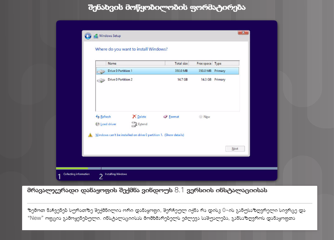 • NTFS (ახალი ტექნოლოგიის ფაილური სისტემა, New Technology File System) – თეორიულად მხარს უჭერს 16 ექსაბაიტამდე მოცულობის განყოფილებებს.  NTFS-ს გააჩნია ფაილური სისტემის უსაფრთხოების ფუნქციები და სხვა დამატებითი ატრიბუტები.  ვინდოუს 8.1, ვინდოუს 7 და ვინდოუს ვისტა ავტომატურად ქმნიან განყოფილებას, მთელი მყარი დისკის ზომის გამოყენებით.  თუ მომხმარებელი არ შექმნის მასზედ მორგებულ განყოფილებებს New (ახალი)ბრძანებით, როგორც ეს სურათზეა ნაჩვენები, სისტემა განყოფილებას დააფორმატებს და დაიწყებს ვინდოუსის ინსტალაციას. თუ განყოფილებას მომხმარებელი ქმნის, მაშინ ის მიუთითებს განყოფილების მოცულობას.