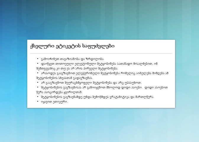 შესწრებიხართ ონლაინ ფორუმზე დისკუსიას სადაც ფორუმის მომხმარებლები თემის განხვილვისას ერთმანეთის შეურაცხყოფაზე გადასულან? როგორ ფიქრობთ, პირისპირ შეხვედრისას ასეთივე შეურაცხყოფას მიაყენებდნენ ერთმანეთს? ასევე ხომ არ მიგიღიათ ელექტრონული ფოსტა, რომლიც ტექსტიც არ შეიცავდა მისალმებას ან დაწერილი იყო მხოლოდ დიდი შრიფტით (ამ შემთხვევაში იგულისხმება ინგლისურში ან რუსულში დიდი ასოებით წერა). რა შთაბეჭილება დაგრჩათ ამ შეტყობინების წაკითვისას?