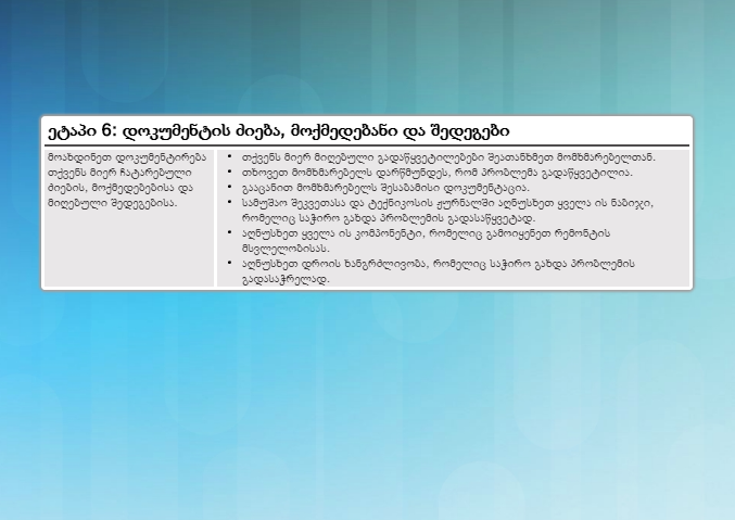 პრობლემათა აღმოფხვრის ბოლო ნაბიჯია დოკუმენტაციის შექმნა თქვენი დასკვნების, ქმედებებისა და მიღებული შედეგების შესახებ. ნახაზზე ნაჩვენებია სია იმ ამოცანებისა, რომლებიც საჭიროა პრობლემისა და მისი გადაჭრის მეთოდის დოკუმენტირებისათვის.